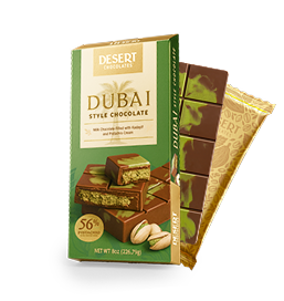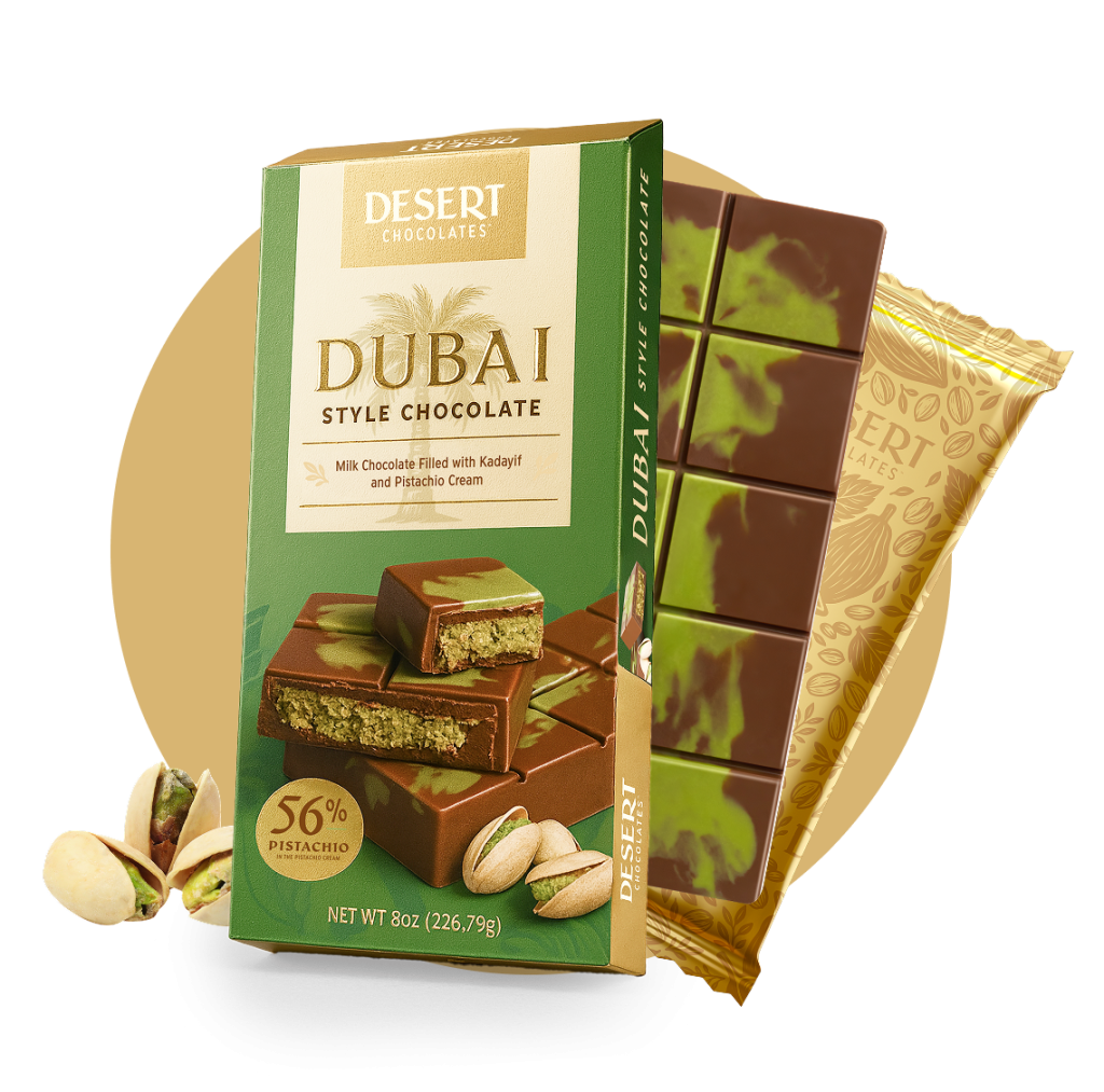 Our signature Dubai Bar blends smooth milk chocolate with pistachio cream and golden kadayıf, a nod to the rich, luxurious flavors of the Middle East. It’s the first in our Desert Style collection.